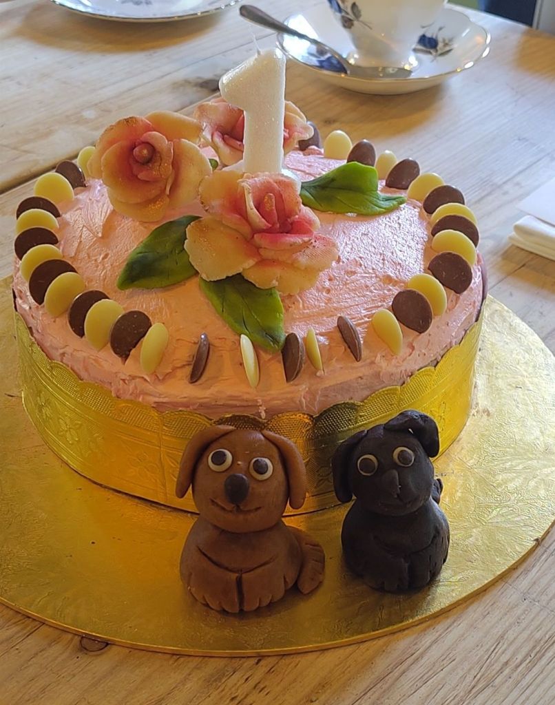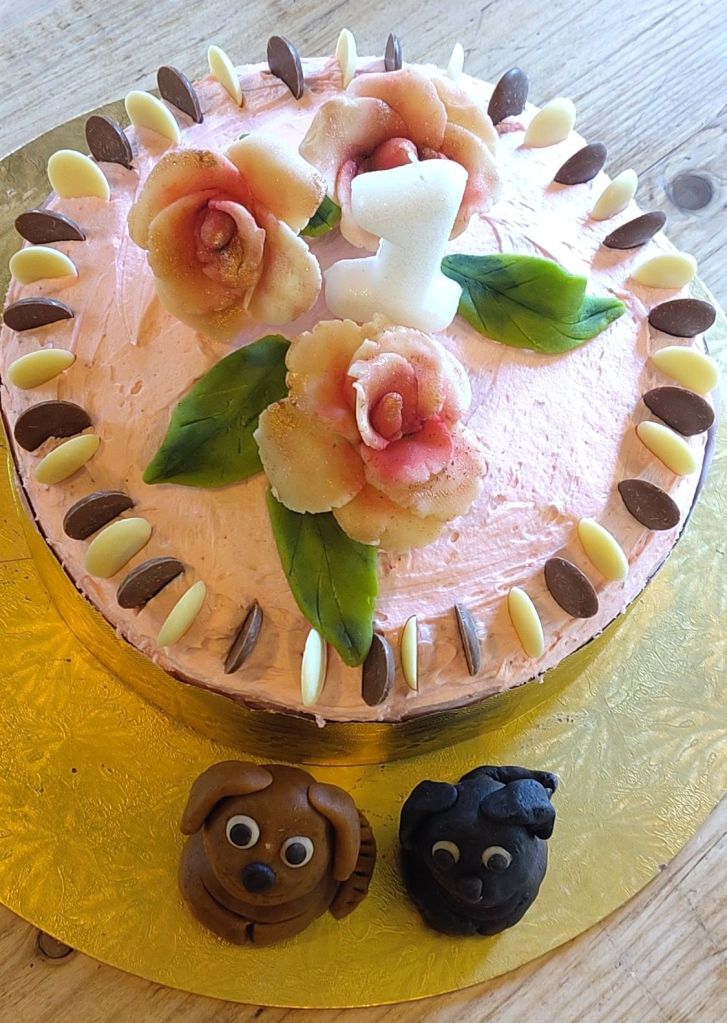 I don’t have any fondant icing so I’ve made the dogs with pale marzipan and it’s actually worked quite well. Then of course I got the bit between my teeth and I thought, ‘ I’m gonna make some flowers now’. I used to make a lot of fondant flowers which I really enjoyed. Sadly, the marzipan roses I have made a little bit clumsier than those made with fondant, but they’re OK and once I got the cake assembled and the buttercream on it I’m sure they will look fine.