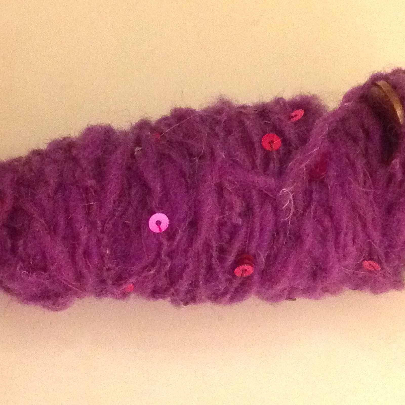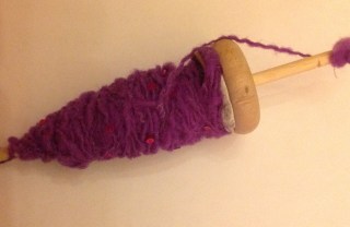 So whilst demonstrating I have spun a reasonable amount of purple tops up, and spent last evening plying this with a thread onto which I have threaded sequins – so have now got a pretty decorative yarn I will knit up and post here when done. Hopefully I have balanced the yarn sufficiently – but we will see. The fibre length for this was much shorter than merino so it is consequently a more woollen effect yarn.