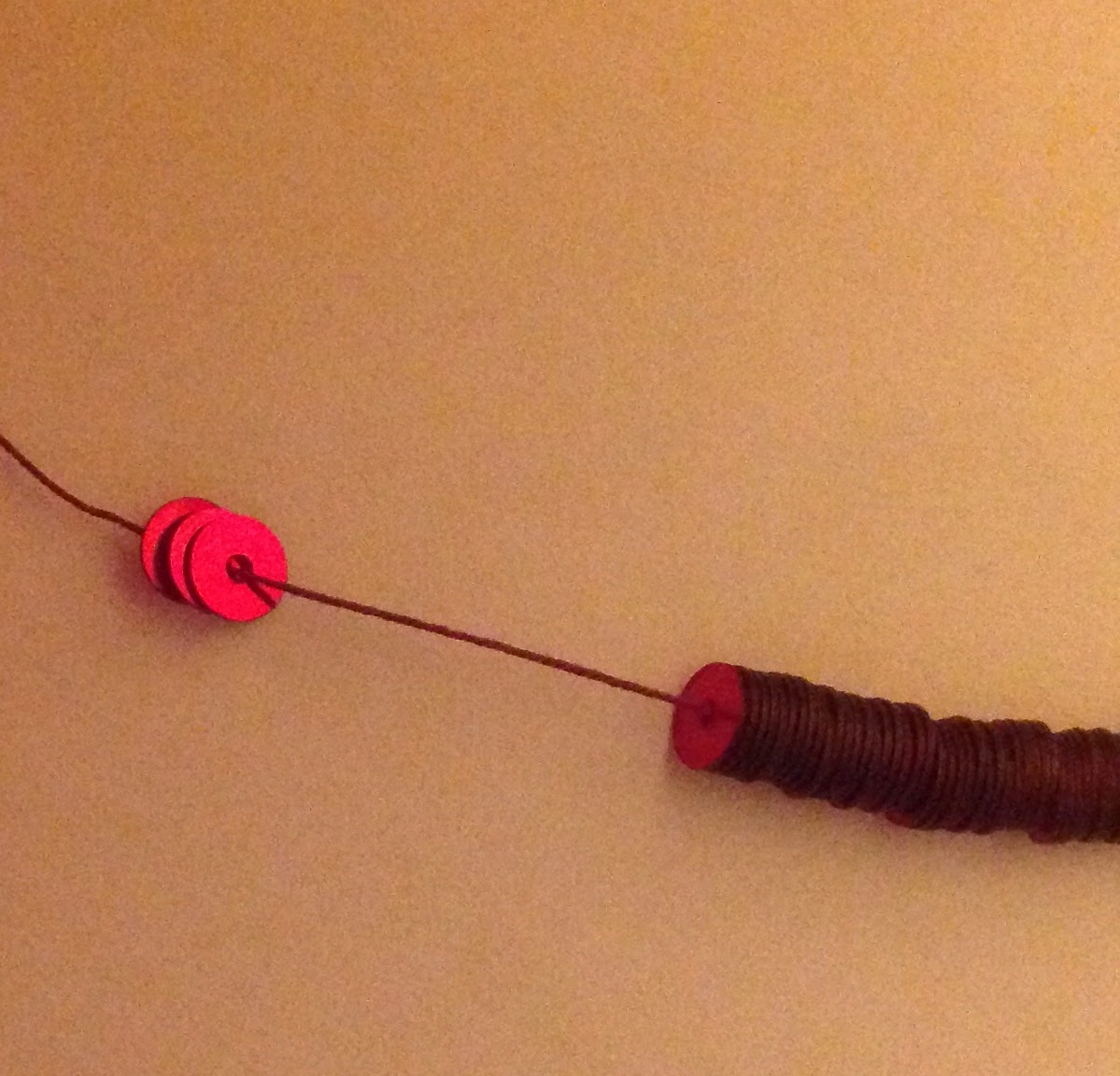 I have made a few quite successful drop spindles out of chop sticks and wooden toy wheels which work well for those who choose not to purchase their own spindle (although as these cost less than a round of drinks I try to persuade them to invest). I discovered the wheels weren’t quite heavy enough, so have added a few pennies secured with BluTak as an interim measure – seems OK for the moment.