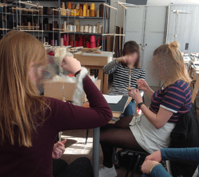 We start with tops so they don’t have to card (time is short for the workshop), and I buy both tops and spindles from Wingham Wool Works http://www.winghamwoolwork.co.uk, and find the dyed Merino tops a really easy one for beginners as the long fibre is more forgiving of slipping fingers and fumbled drafting.