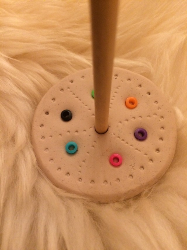 Last year I used Fimo. This made lovely whorls, but was expensive. I found this year’s air hardening harder to work with, but that may be because I added a thicker outer ring to the whorl to improve the mechanics of the spin. I read this on a spindle-making blog, and it works. Just looks messier. I will try one in Fimo next.