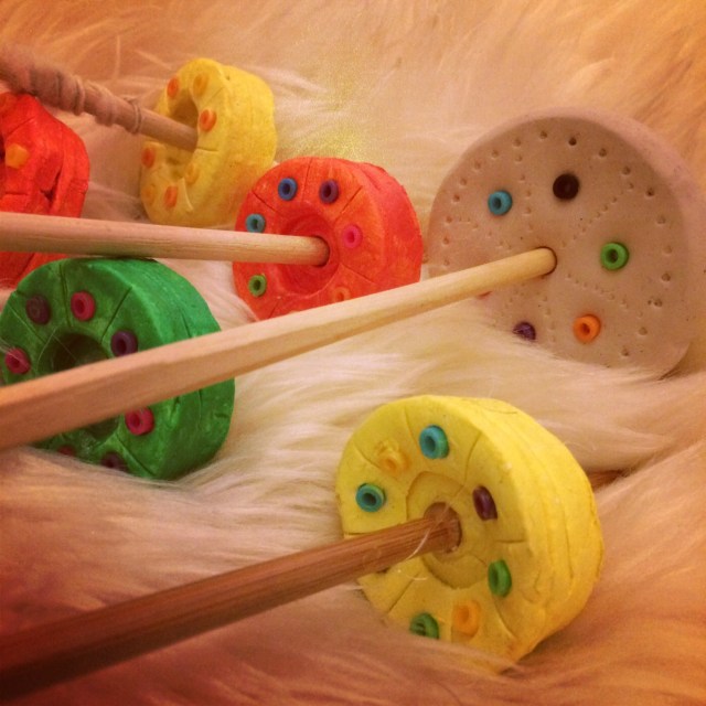 I will be running a hand-spinning workshop with the first year knitters next week. We have a couple of spinning wheels, but I have found it most successful for the students to work individually with drop spindles and take turns in the wheels. I make spindles as it gets costly to buy 12 or more of these. The ones this year are made from 50g air-hardening clay and dowel or chopsticks and decorated with beads pressed into the clay. To seal them I’ve painted them with PVA paints. On some the central hole was a little big, so a bit of glue has secured this, and a rubber band underneath. prevents any slippage.