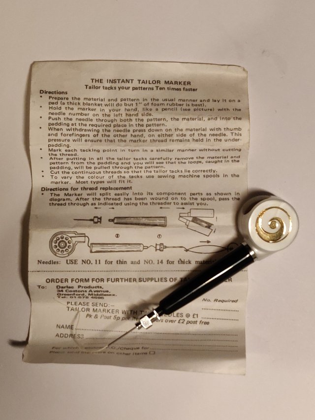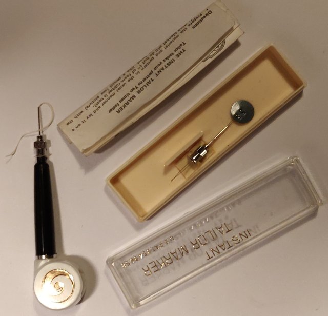 It’s called the ‘Instant Tailor Marker’ and it has a hollow needle. The thread is wound onto a normal sewing machine bobbin (which sits in the round housing at the end of the tool), and is threaded through the hollow needle. To make the tailors tacks you poke the needle through the layers of fabric. The instructions say to use a piece of foam behind the fabric. You push the needle in and out of the fabric and the thread catches in the foam. When you pull the fabric away from the foam it releases the thread, and then when you open the layers of fabric you can snip the tacks between the fabric, et voila tailor tacks all done!