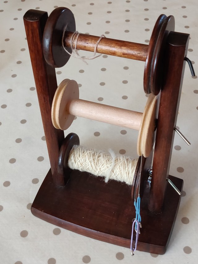 However, as you can see it’s much the same set up. Fishing wire brake bands go over the larger whorl and are held in place by eye hooks on one side and open hooks with elastic bands on the other. Springs will help even the tension and fiddling with the elastics lets you tension each bobbin independently. This is useful for fancy plies.