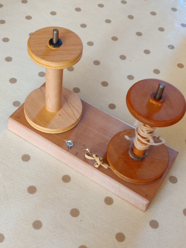 For a while I’ve been annoyed by the fact that bobbins jump around on my Lazy Kate when I’m plying yarns. I’ve got an Ashford one that the bobbins lie horizontally on and another on which the bobbin sit upright, and neither are very satisfactory. Various versions of a beautiful, tensioned Lazy Kates passed infront of my eyes as I visited various shop sites, but eventually my careful nature asserted itself and I decided I would be able to do this myself. More trawling t’internet followed and finally I had gathered a few ideas for both style of equipment. So I grabbed my little Dremel tool and got started.