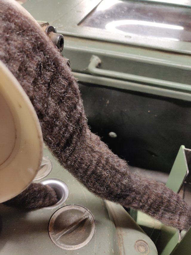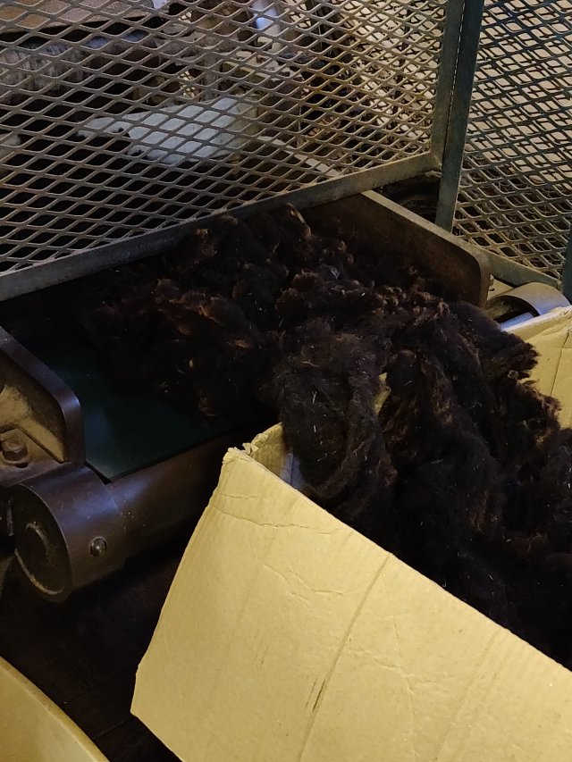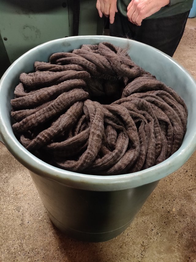 Following picking, the next process is carding the fibres to start aligning them in parallel into a continuous ”sliver’ of fibre. Unlike my meek little hand carder, they have a carding machine with 16 drums of metal, not wire, teeth. At this stage, any short fibres will still be in the sliver, it isn’t until combing that these will be removed.