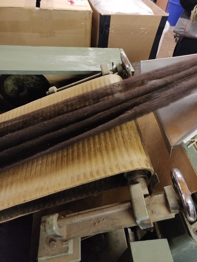 If the requirement is for carded roving for hand spinning, this will be the last process. It may even be stopped earlier on, depending on what condition fibre is required.