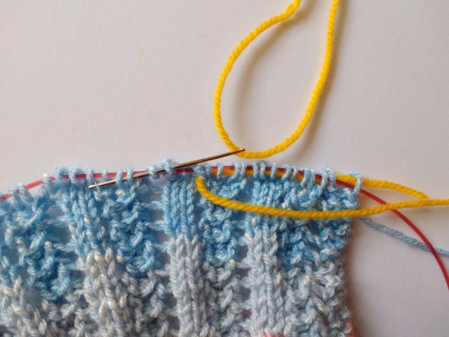 The image below shows a lifeline (yellow yarn), being inserted into lace knitting being worked flat, but using a circular needle. A circular needle has a thin wire in its centre (in this case its a red wire), and sliding the stitches onto the wire before inserting the lifeline creates more space inside each stitch, making it easier to thread the lifeline through.