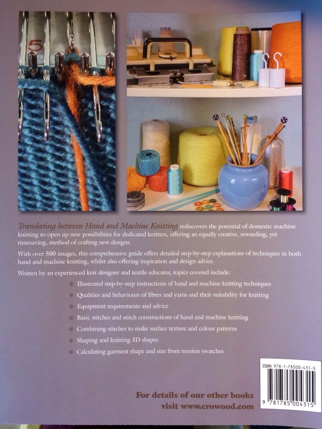 ‘Translating Between Hand and Machine Knitting‘ is now available online from The Crowood Press website, and will shortly be on Amazon and in bookshops. If your local bookshop doesn’t stock it, do ask them to order it, or put a copy in stock! Ask your local library to consider purchasing a copy – it really is a treasure trove of information for knitters of all types.