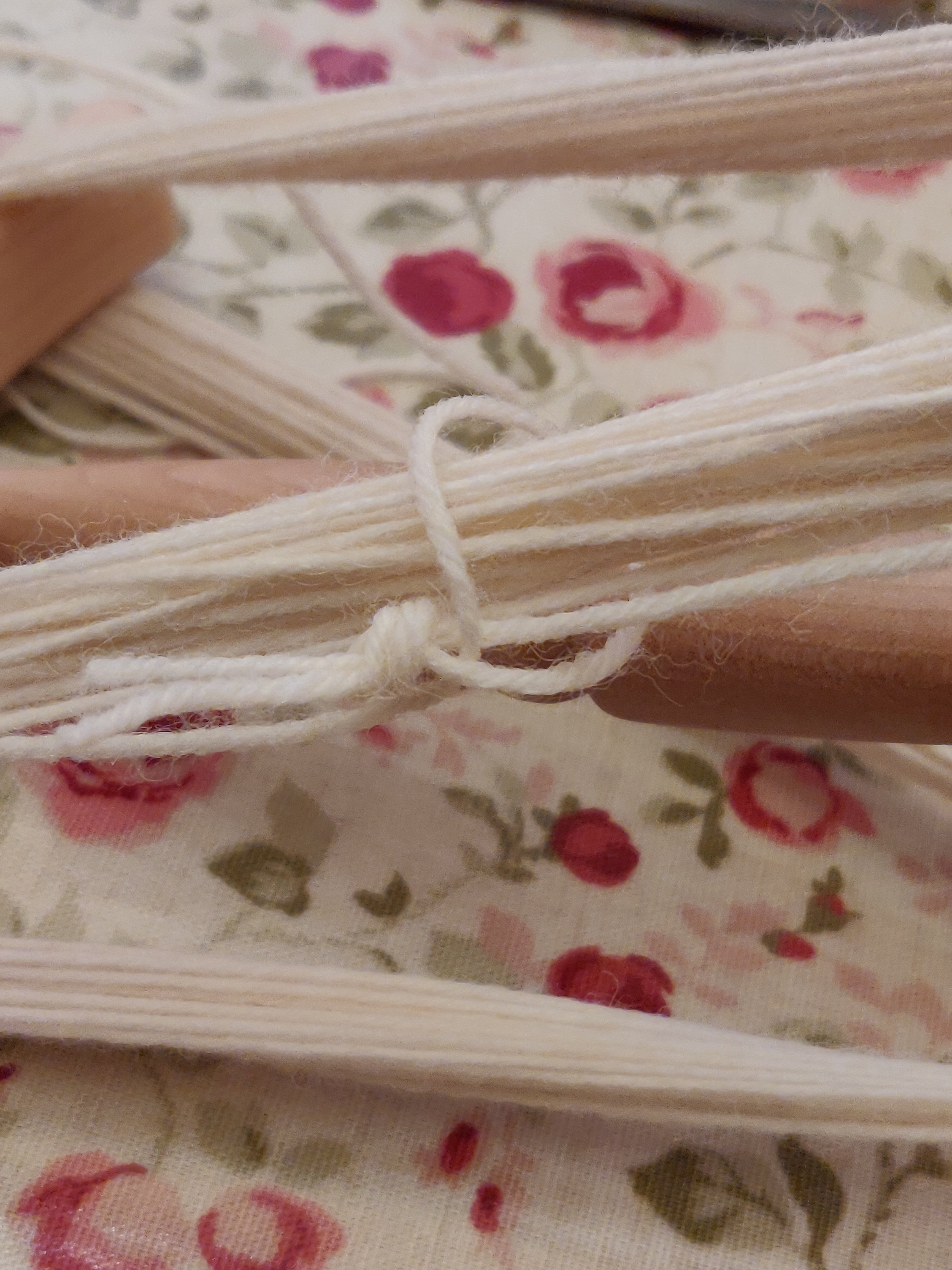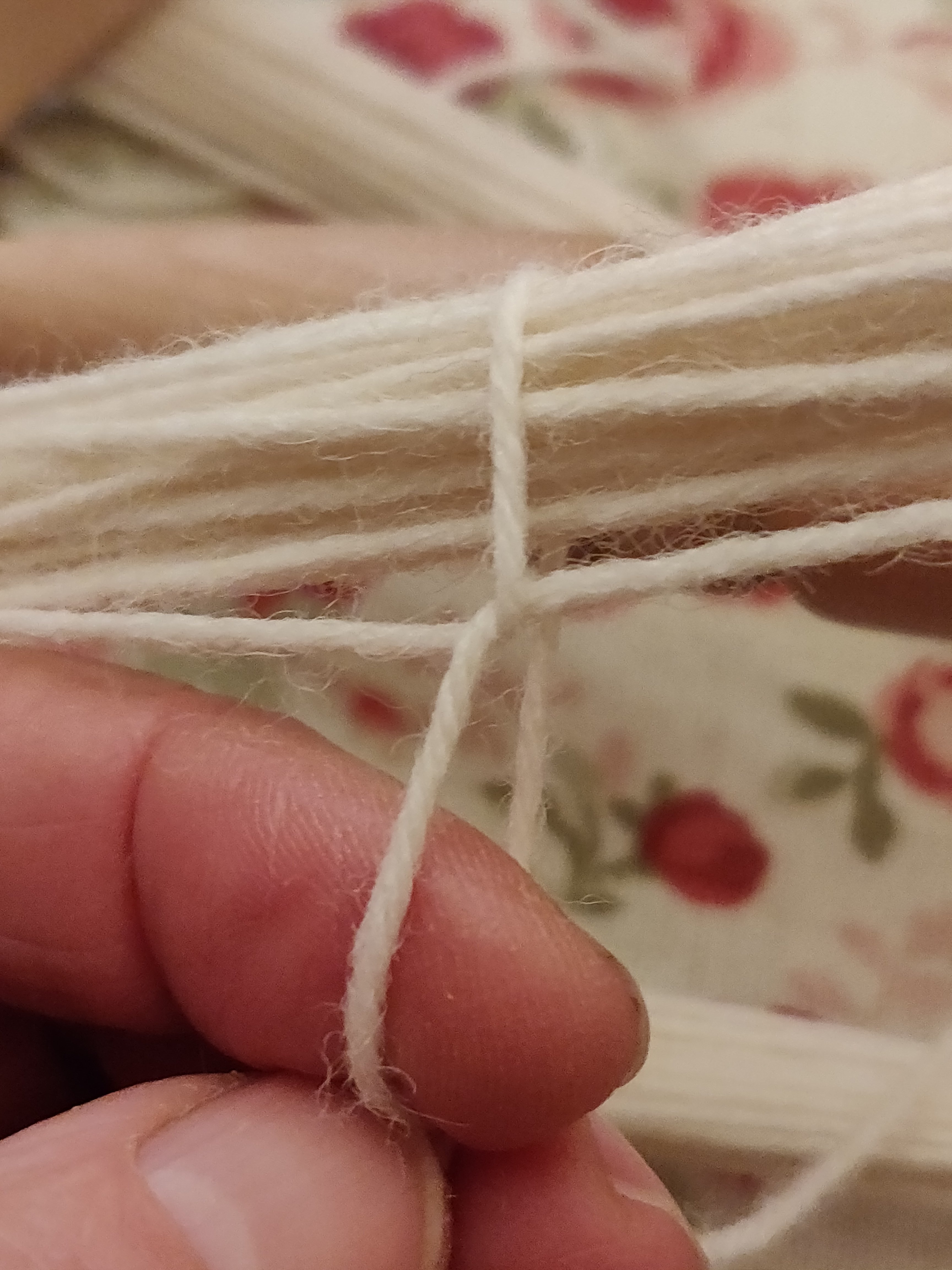 Undo the loose knot from the central pole. Holding both ends of the yarn wrap them around each other, take one end around the hank, bring it back to the front and keeping the loop around the yarn loose, tie the ends together with a firm knot.