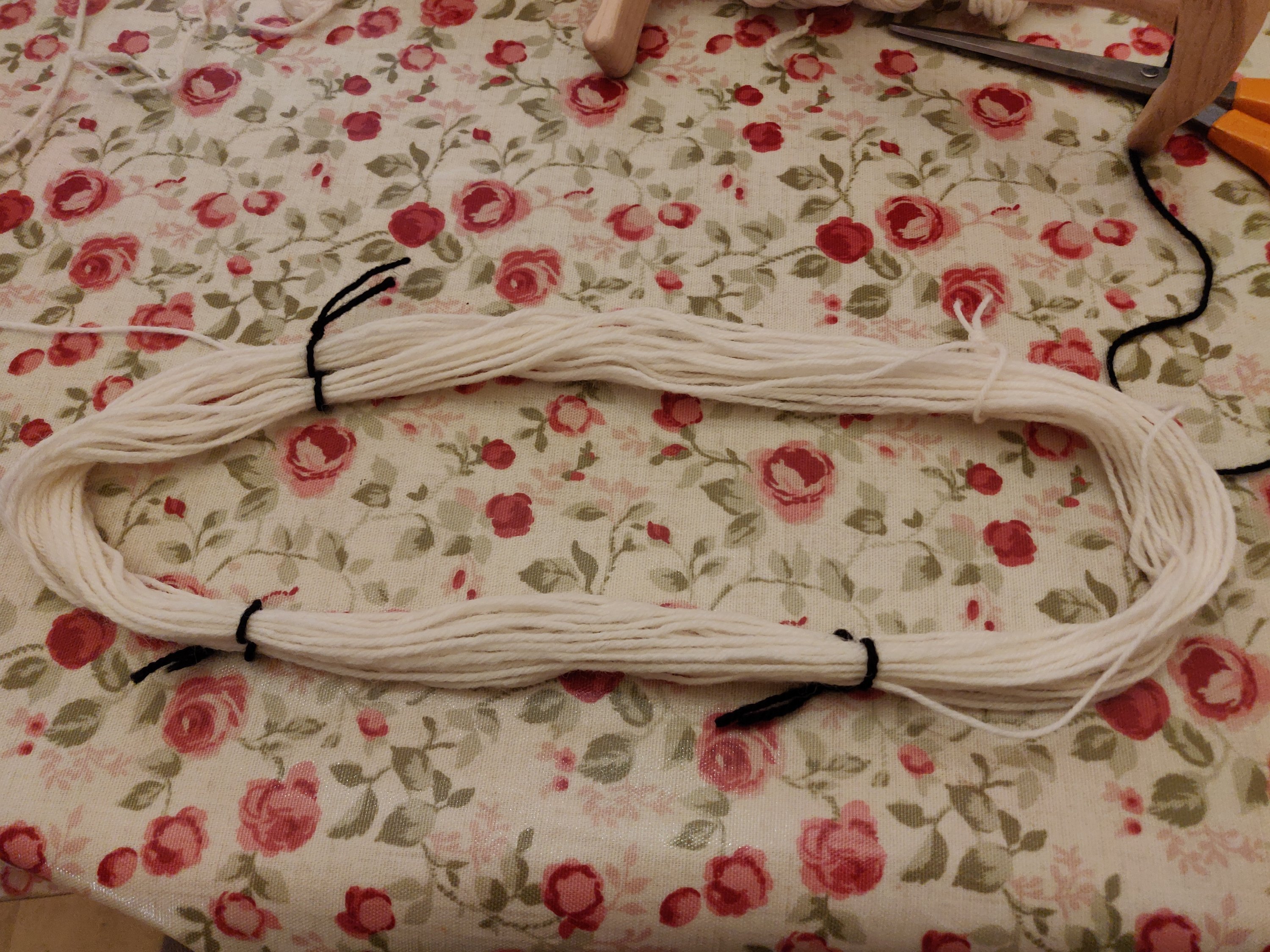 For sample hanks I usually add three leases, as follows. Cut three lengths of spare yarn. These should each be long enough to wrap about four times around the strands of yarn in the hank. Mine were approximately 15cm. Choose a white or ecru yarn for this, or one that you know is colour fast. Even if you’re not going to dye the hanks, be careful as coloured yarns may transfer fibres and colour onto pale yarns.