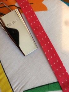 When cutting the flat strips, cut them 2mm narrower than double the width of the final binding; so for a 25mm binding cut the fabric strips 48mm wide. In practise you will find that some fabric need to be cut a little wider. This is because when you pull the finished binding through the maker, some fabrics stretch more, producing a slightly narrow binding than intended, and of course the inside folds also become narrower. I suggest practising a bit with some short spare strips from the corners of the fabric before cutting the main strips.