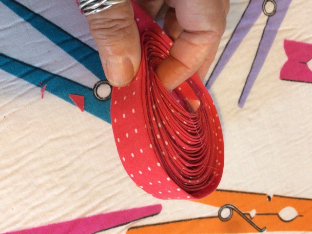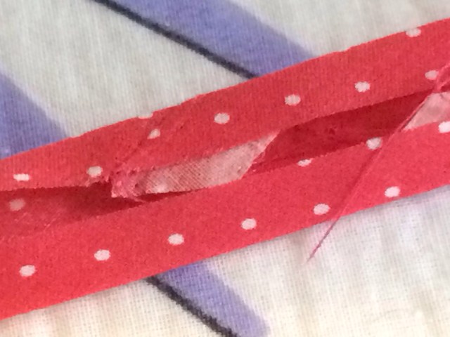In principle, you cut the fabric diagonally across the bias of fabric into strips that are then folded along both long edges so that these edges meet along the centre of the strip.