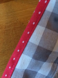 Because fabric is not infinitely wide, you are going to have to join your binding to get the length you require. Join the pieces so that they make a right angle when the diagonal ends match up when laid over each over. Remember to have the right sides together!