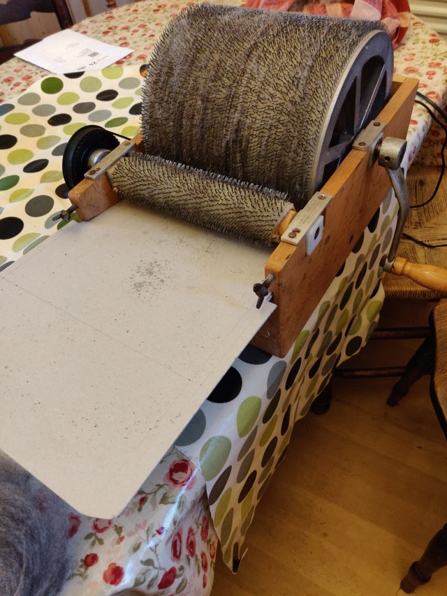 It’s in reasonable condition, and I had bought a new belt a while ago in anticipation- which was lucky. That went on easily and there was one problem, it has lost its feeder plate, so I’ve improvised with a very thick card cut to shape which seems to do the job. I’ve got nice batts off already.