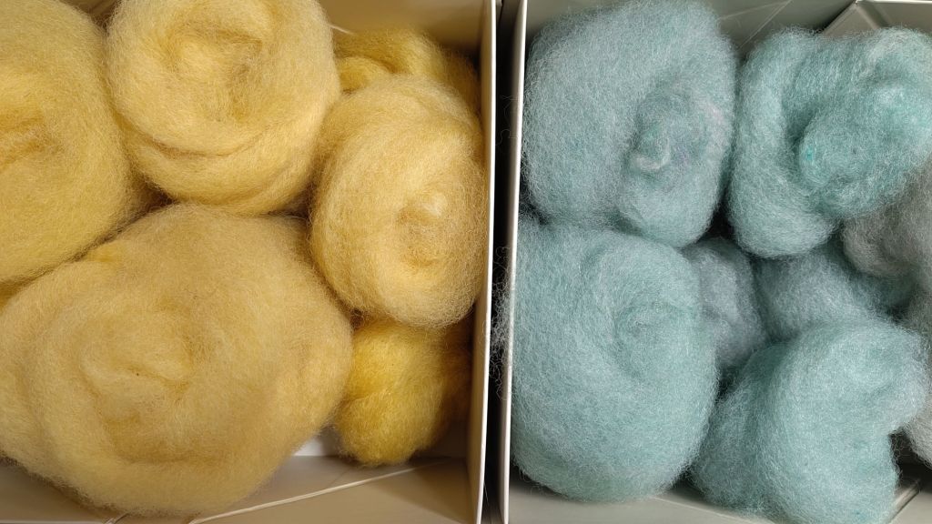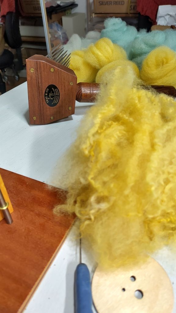 I now have two boxes (around 300g) of delightful hand combed sliver in slightly melange yellow and a similarly mixed pale blue that I have to decide how to spin.