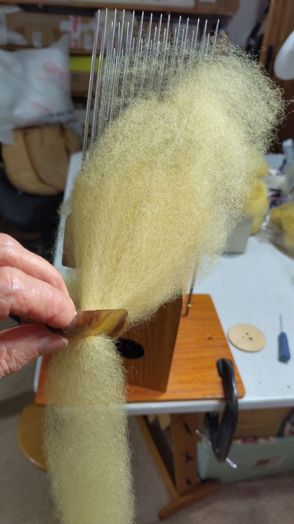 I had a box of hand dyed locks ready for combing which gave me a great opportunity to get to know the combs. I had dyed these locks quite a long time ago using Buddleia flowers, and they were a bit compacted so I had to pick them over first and open them up.