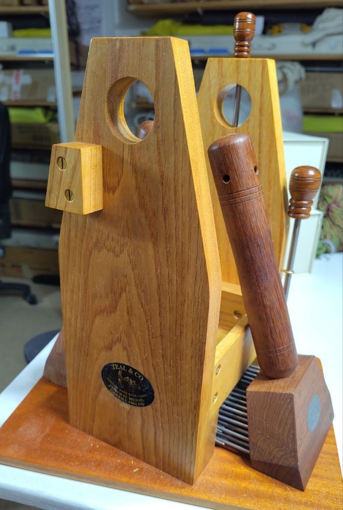 I’ve been really fortunate to acquire a set of Peter Teal English wool combs which have taken a while to master. I’ve been using Valkyrie Extra Fine combs with a stand up until now, which are great, but I couldn’t resist the Peter Teal ones when they popped up. These combs have four lines of very long tines instead of the two on the Valkyrie, and are overall much bigger. Each comb weighs somewhat over 400g, compared to the Valkyrie’s 300ish grams. The stand is higher and sturdier and allows you to turn the combs on their side which is quite a useful position as it means there is no need to swap the combs over. The stand has a more flexible fixing system with a stop-block so that the comb which is on its side is securely supported. Sets of combs were made for right-handed and left-handed users and this stop-block is positioned to keep the comb at the most suitable position.