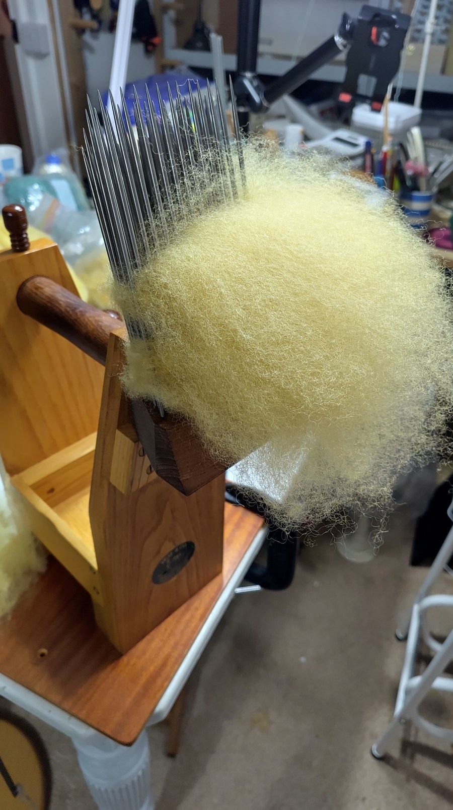 I’ve been really fortunate to acquire a set of Peter Teal English wool combs which have taken a while to master. I’ve been using Valkyrie Extra Fine combs with a stand up until now, which are great, but I couldn’t resist the Peter Teal ones when they popped up. These combs have four lines of very long tines instead of the two on the Valkyrie, and are overall much bigger. Each comb weighs somewhat over 400g, compared to the Valkyrie’s 300ish grams. The stand is higher and sturdier and allows you to turn the combs on their side which is quite a useful position as it means there is no need to swap the combs over. The stand has a more flexible fixing system with a stop-block so that the comb which is on its side is securely supported. Sets of combs were made for right-handed and left-handed users and this stop-block is positioned to keep the comb at the most suitable position.