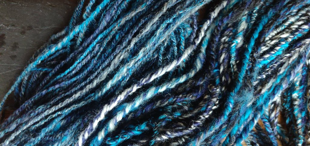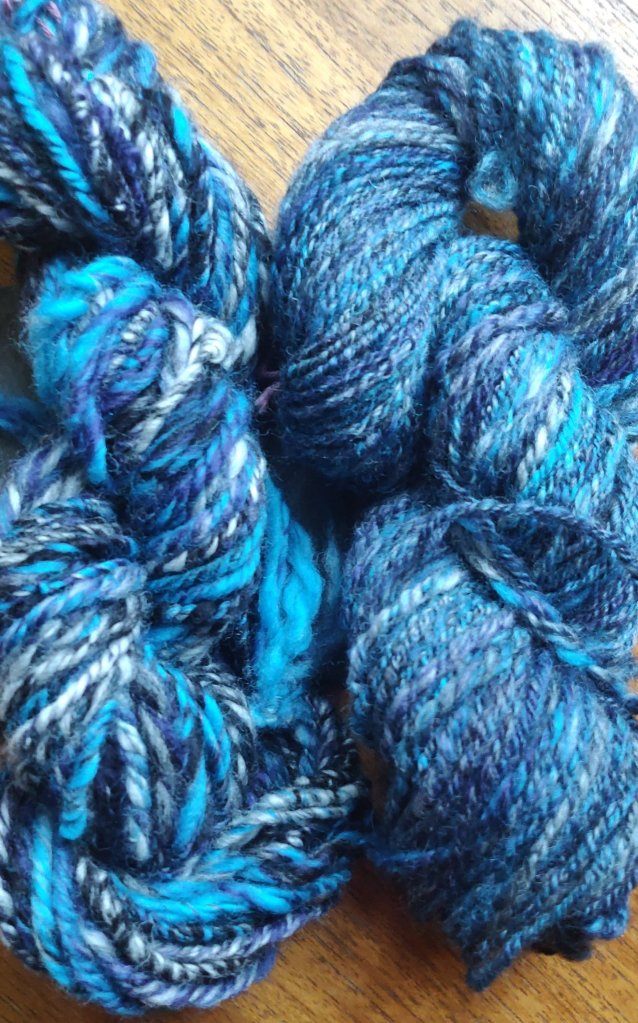 Well I’m pleasantly surprised. As we know, you can’t predict a yarn’s outcome straight off the wheel. Both hanks hang straight, no weights added, they just did it themselves! The thinner is coming up at about 10 WPI and the thicker at 7-8 WPI.