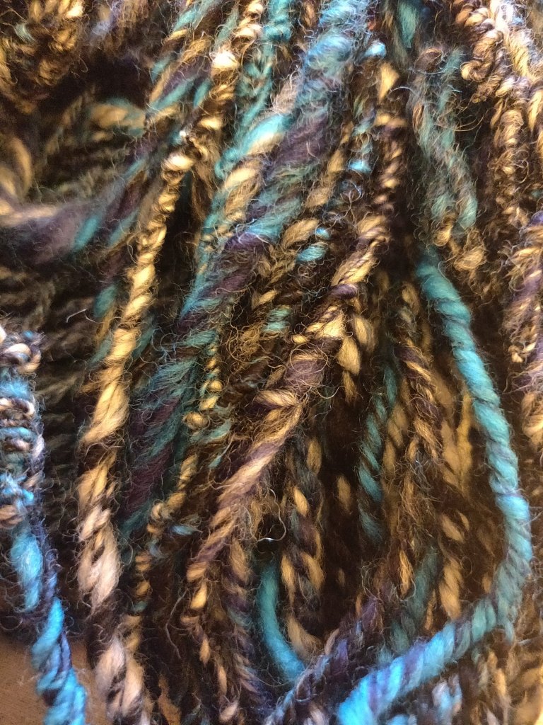 This was only my second attempt at chain plying, and it took me a few metres to get going. Consequently, the thicker singles, with which I started, is not as even as the thinner yarn I plied later on.