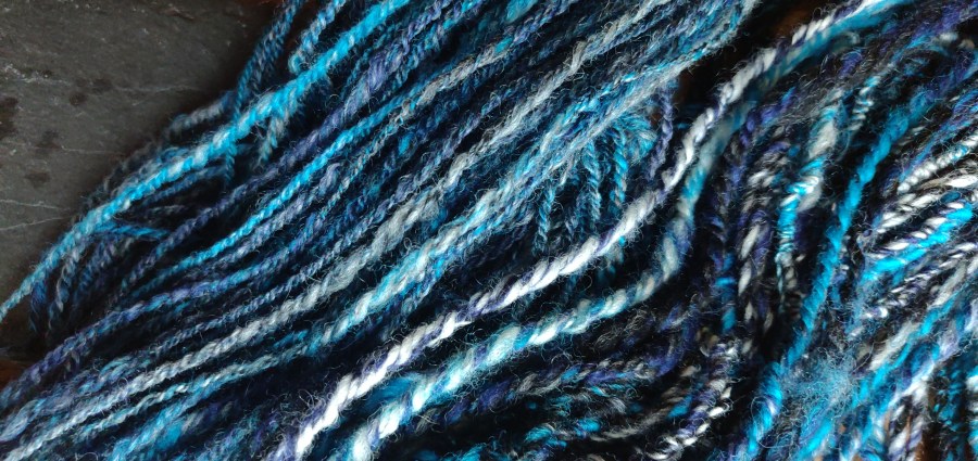 The thicker yarn has retained it’s colour definition much more clearly. The tourqoise zings out at you, and the black and pale grey make lovely marled sections. However, something is not quite right with the twist. I seem to have managed to over-twist some areas and under-twist others and I’m not sure how I did this! In an attempt to even it out I ran it back through the wheel Z twist fast, on the large whorl. This helped reduce the over-twisted lengths somewhat, but also resulted in the under-twisted sections becoming even more so. It looked a bit of a mess and was twizzelling back on itself significantly. I decided to hank and wash both yarns and see what happened.