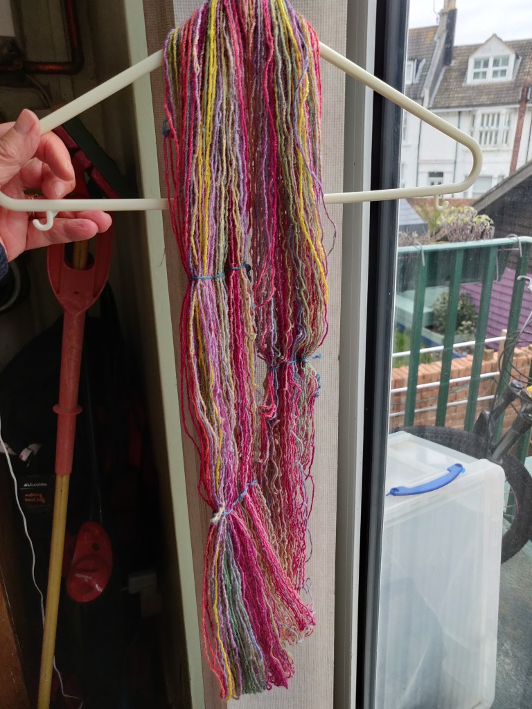 So now the yarn has been hanked, washed and dried it’s only got a tiny bias when it hangs. I think this will knit fine! I have the wet hank a slapping and twanged it a few times but left it to dry without any weights. I think this will be very springy, strong yarn so may use it for socks.