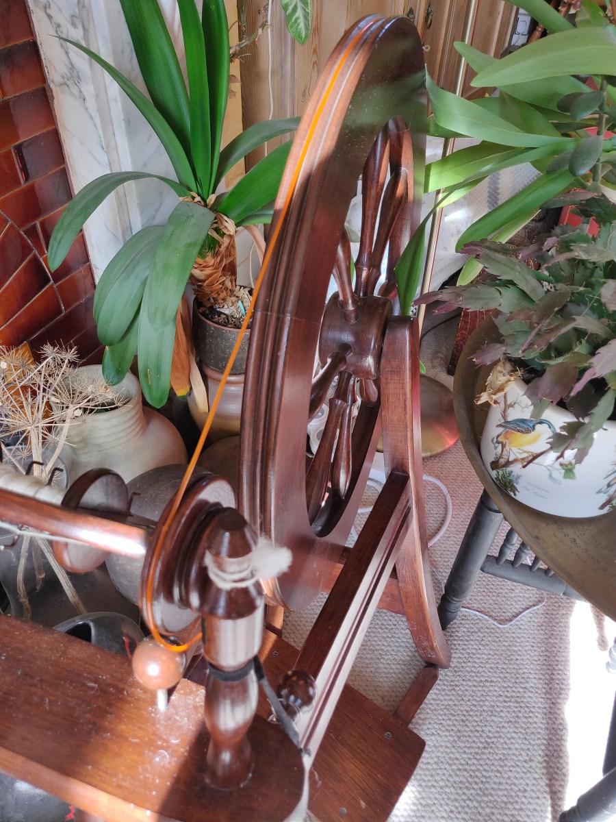 I have replaced the drive band on both my Ashford wheels with poly drive bands. These are great as they work at low tension because they have a slight tacky surface, and don’t stretch. They are a bit of a bother to fit initially, but once on they work brilliantly. Of course once on they are on, they can’t be undone without cutting the band. I bought the first one from Ashford, it’s transparent and 3mm thick and they provide a jig in the pack which helps you creste a smooth join, which is essential. However, these band’s are quite expensive, so after a longish trawl of the internet I bought a slightly thinner, but essentially the same, drive band on Ebay. It is a bright orange, which is fine with me, but does setract a little from the overall look of the wheel. I bought 10 metres and will see if it will work to replace the band on my old double drive wheel as well. I think not because of the cross over, but we will see. I highly recommend the poly drive bands, but if you’ve only got one wheel to fit, I suggest buying the Ashford one because that little jig makes fitting the band so much easier than without one.