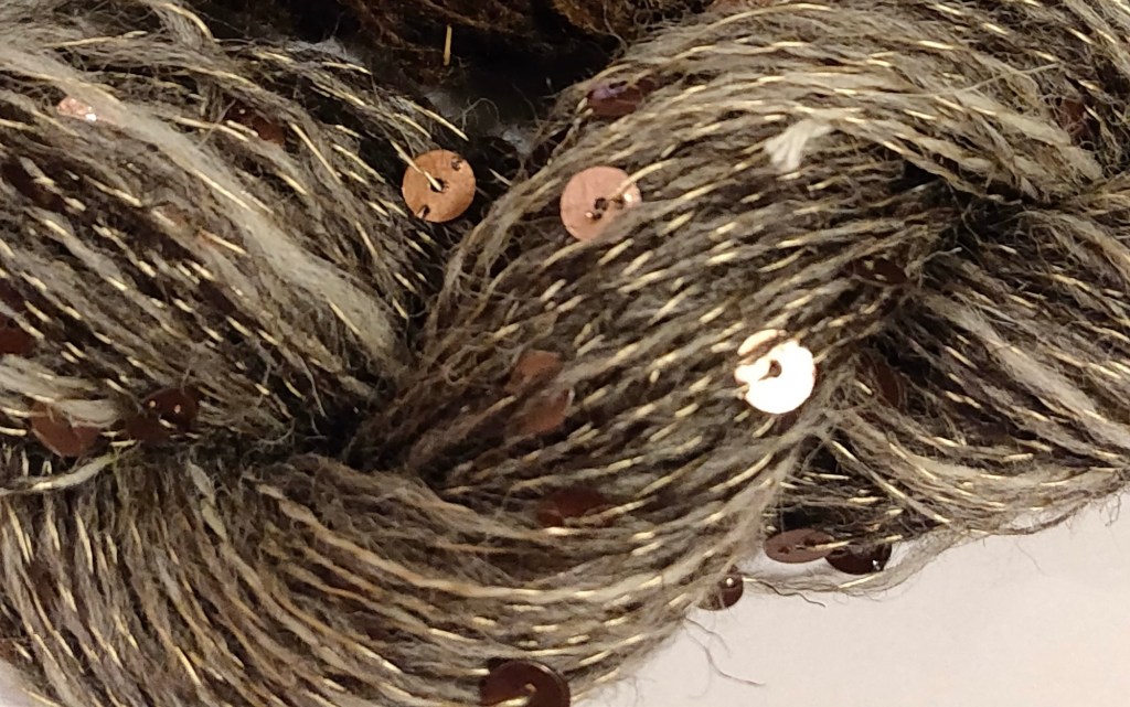 I was caught by surprise when my sequin embellished Jacob’s yarn won one of the categories as there are far more skilled and experienced spinners in the Guild than me. I think it must have been a lucky fluke, but nonetheless I was very honoured to receive the Morfudd Roberts Memorial Trophy. It now sits in pride of place in our dining room.