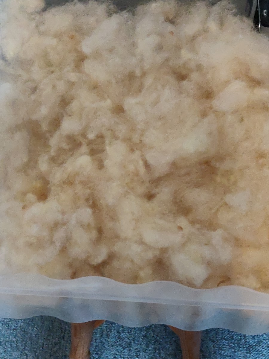 I have a large sack of Texel fleece that had been making me feel guilty for a while. It’s not the most soft of fleece so I decided to blend it with some Alpaca that has also been lurking in the cupboard. Unfortunately the Alpaca (from an animal called Kiki), has quite a bit of VM in it, but it is deliciously soft.