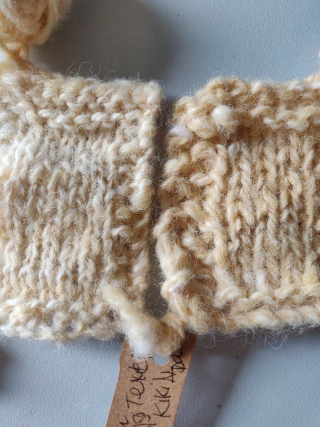 I’ve hand knitted small samples of the both yarns The thicker spun on 6mm needles and the long-draw spun on 5mm needles