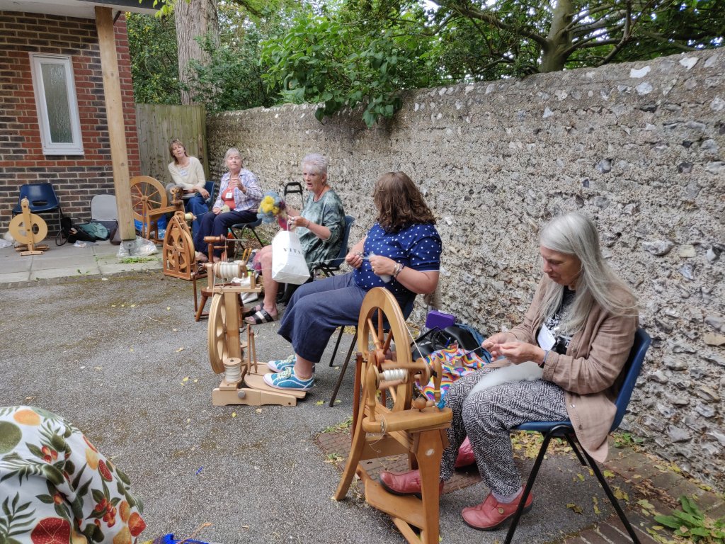 Our local Textile Arts Group (TAG), finally managed to meet today. Eight of us met up with Covid secure arrangements and as the weather was sunny we were in fact able to sit outside the hall to spin, knit and talk.