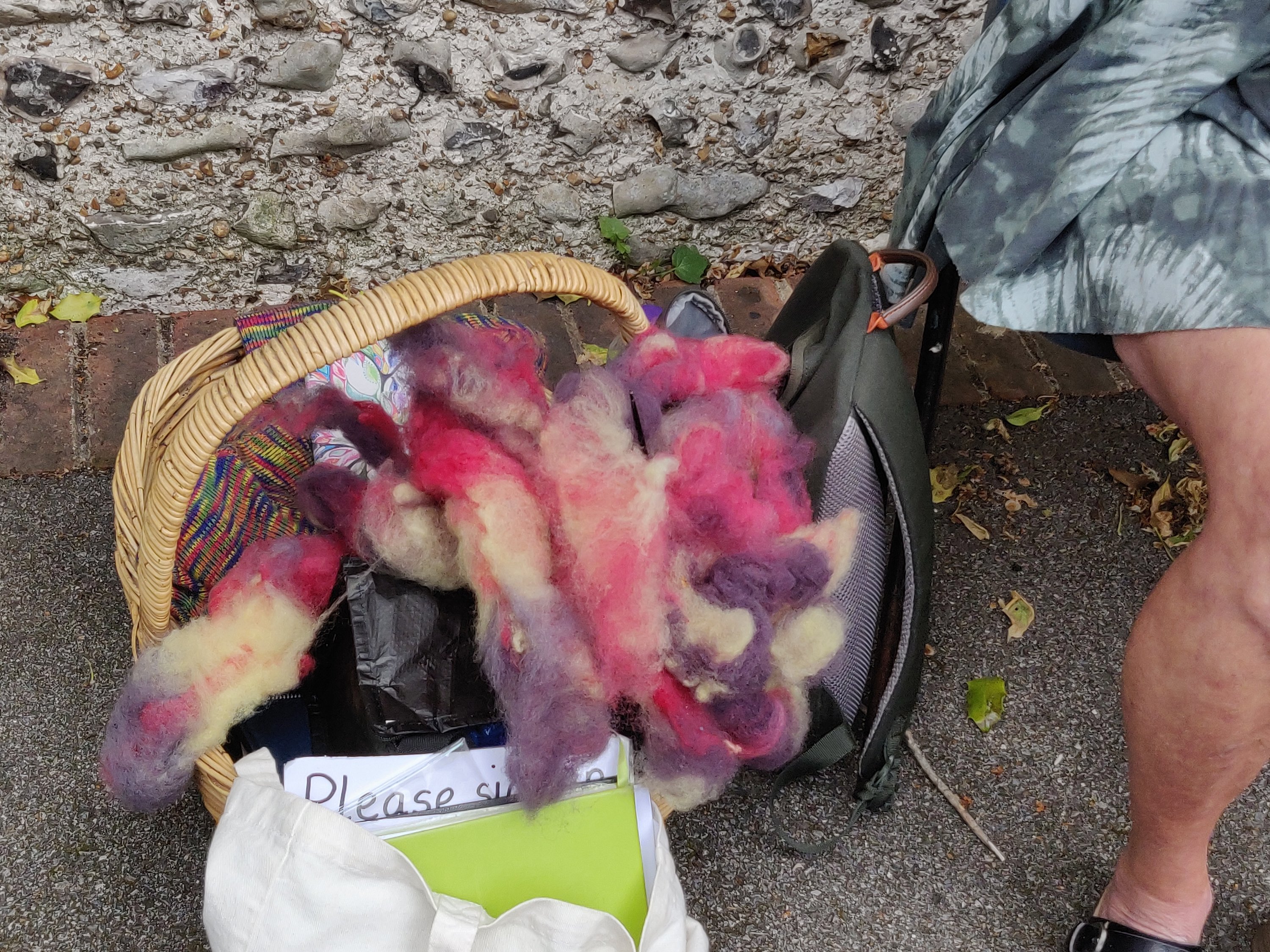 I took along a sack of stove-top rainbow dyed fleece as described on my Dyeing Wool page. It’s a little coarse, but in nicely formed locks, so I am flick carding it and spinning it quite thick for use in a rug, (maybe)?