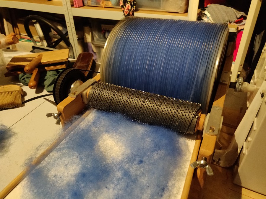 I tested this first on hand carders and it produced a very nice yarn so now I’ve done it in bulk and taken rolags of a batt from the drumcard.