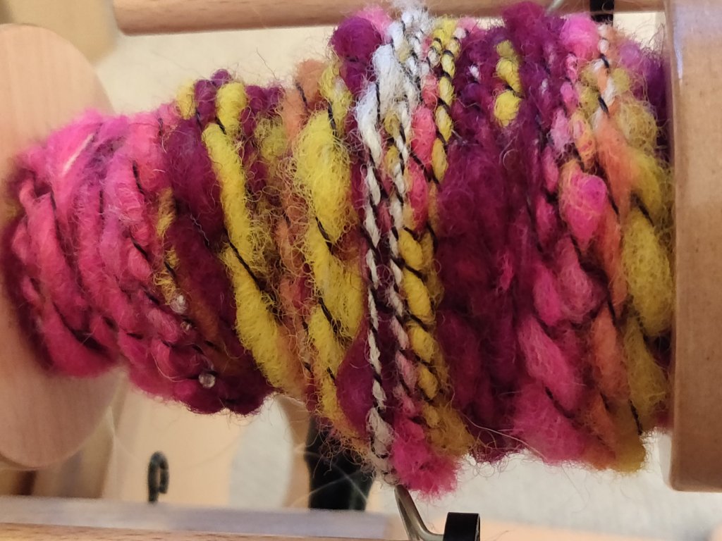 The core yarn was Z twisted quite tight. The wrapping colours were also put on Z twist, and the final charcoal, commercial yarn was S spun over the others.