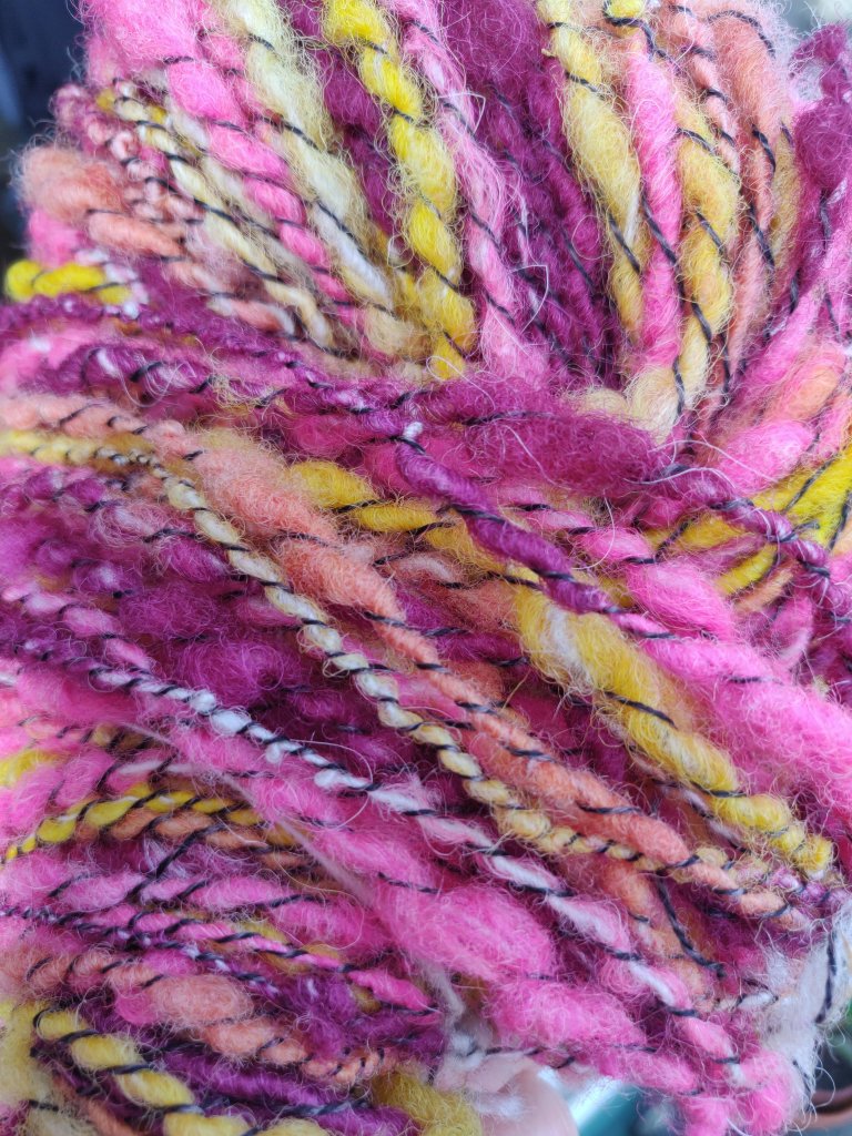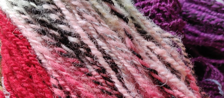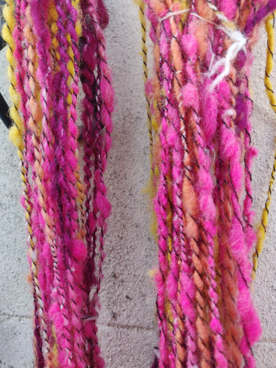 The completed yarn was dip dyed in the same dye pot as the silk/wool yarn, plus another pink dye I had on the go. It was dipped a little into some yellow as well. Over-dyeing this black and cream marl yarn gives the impression of many more colours than there really are.