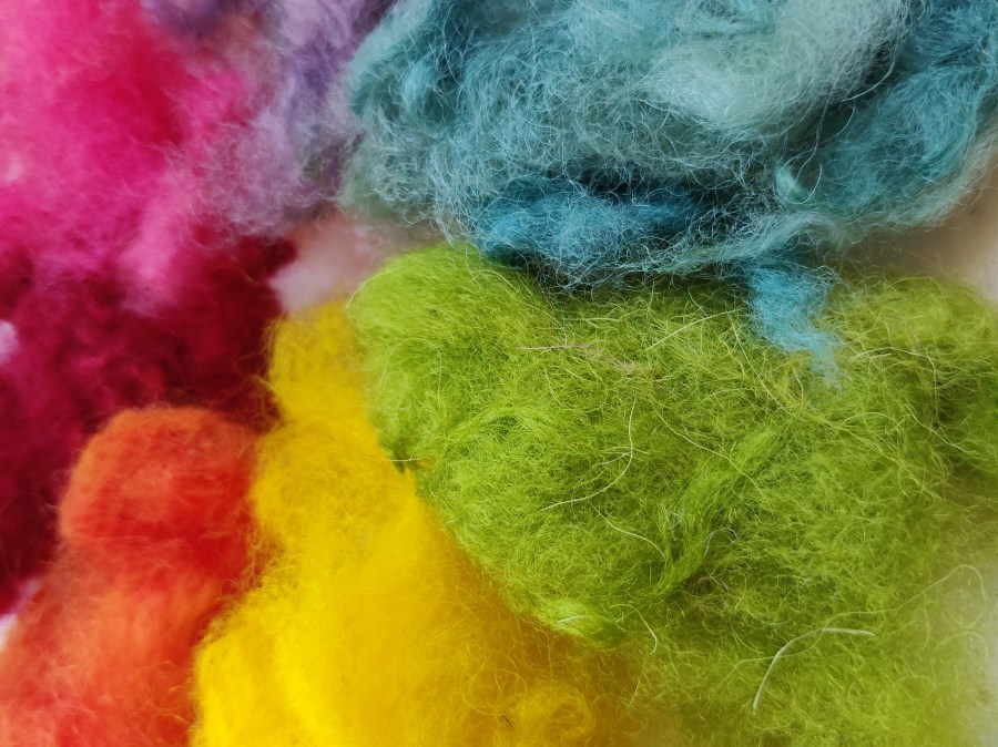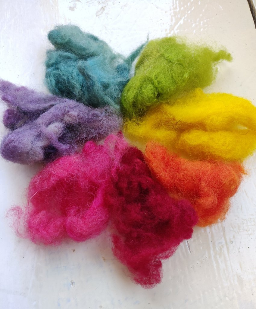 Pink, greens, dark red, yellow and orange. I’ve just completed a blue, but it’s still wet so will have to wait to be added later on. I added another batch of fleece to the finished due bath to exhaust it totally, which gave me a pretty pale blue.