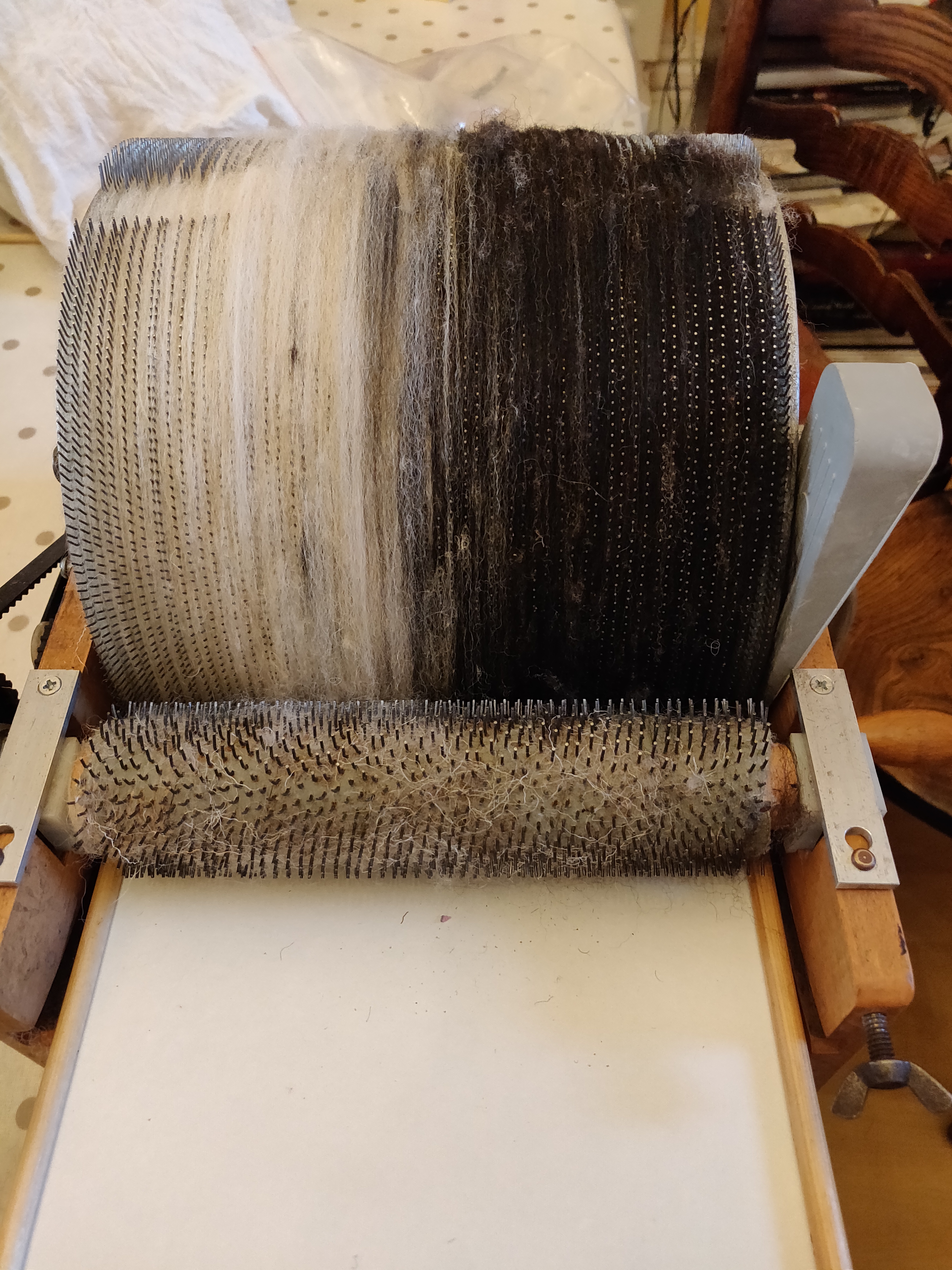 I tested this first on hand carders and it produced a very nice yarn so now I’ve done it in bulk and taken rolags of a batt from the drumcard.