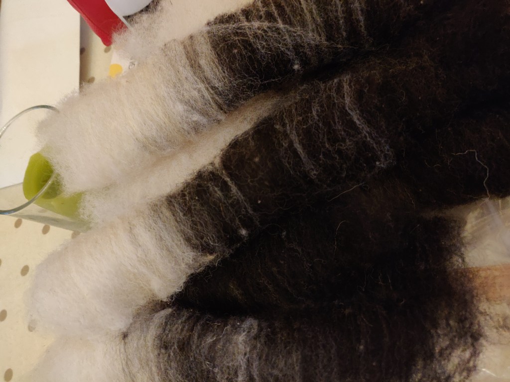 2. Then split each length lengthwise into 4, (or more, depending on the thickness of the roving/batt).