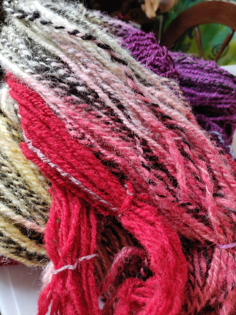 A recent stock-take of the various bits of hand-spun yarn sitting on bobbins I now want to use for other projects inspired me to ply them all up and dye them into interesting yarns. Only small quantites of most, but great for small items.
