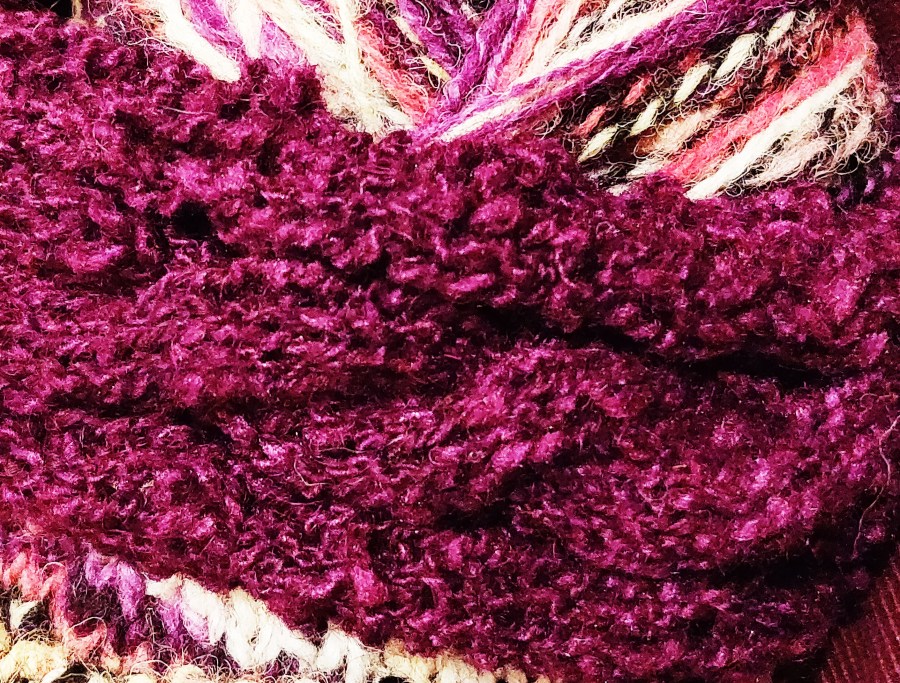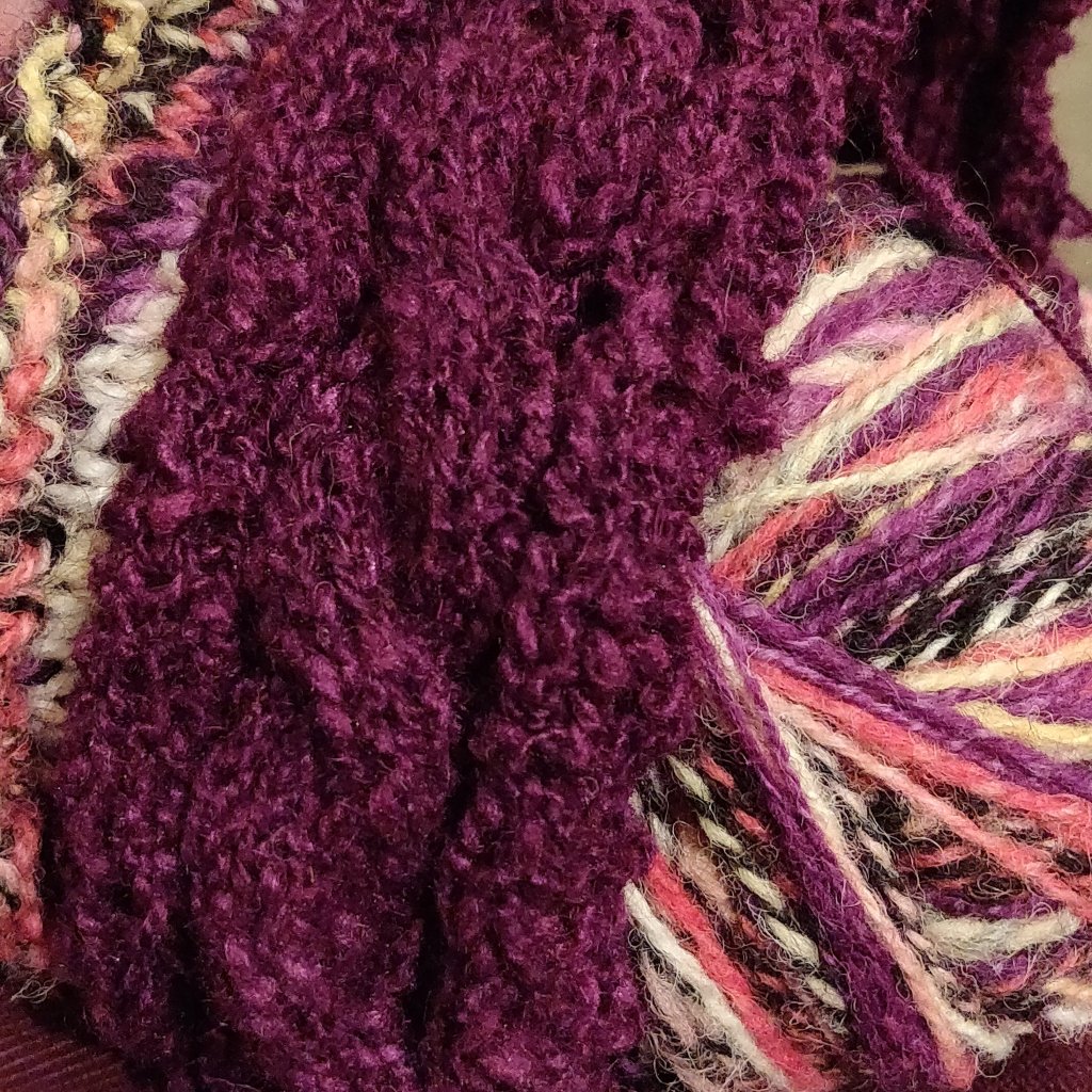 Dark red in front, dip dyed tweed in the middle, blue-violet at the back. You can just see the texural Tusssah silk blended purple yarn.