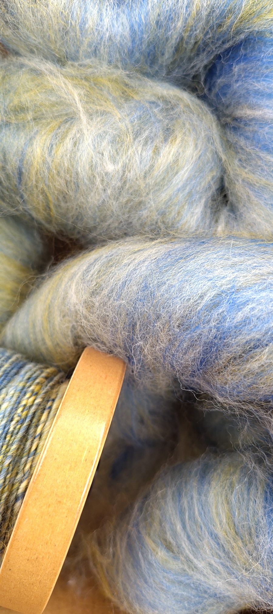 The yellow and natural are broken Merino tops that I picked up at the John arbon Open Day last year. I’ve blended these in equal parts with a very strong ultra marine blue which I won in my local Guild raffle.