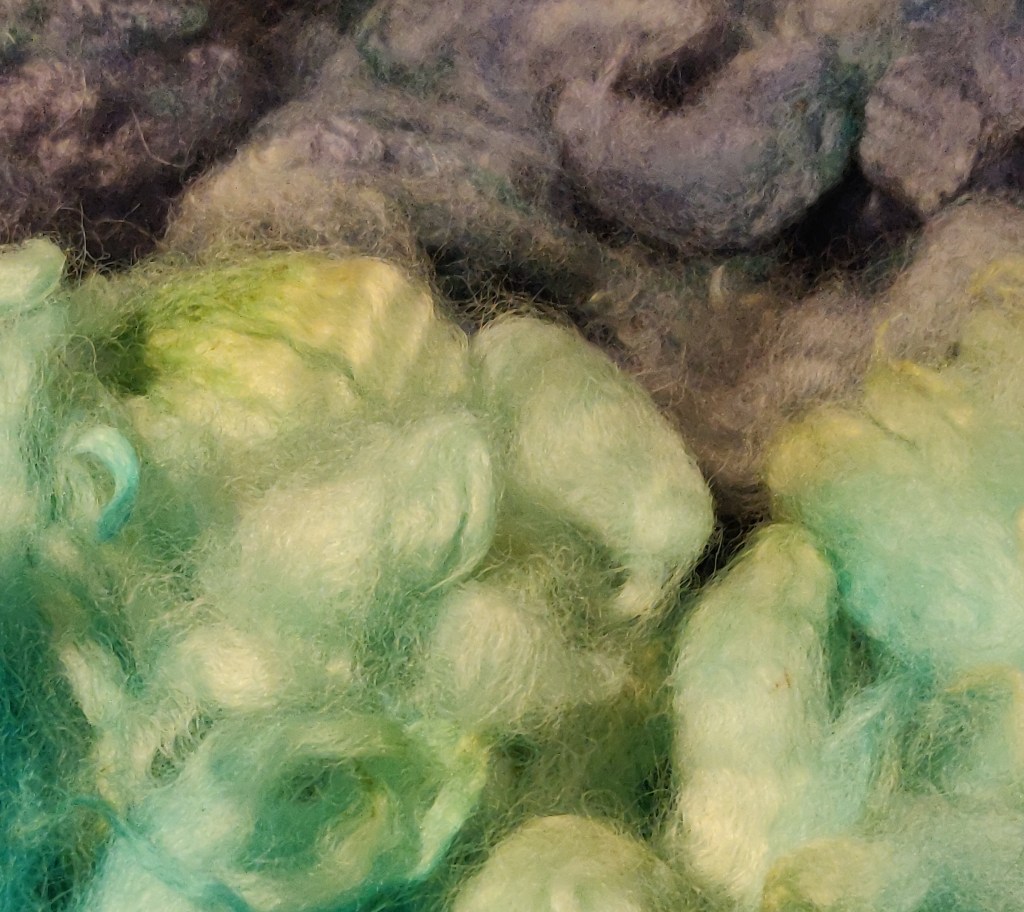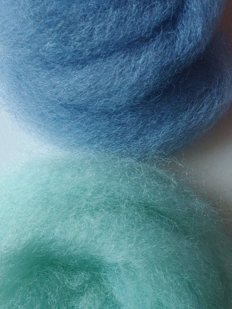 The yellow and natural are broken Merino tops that I picked up at the John arbon Open Day last year. I’ve blended these in equal parts with a very strong ultra marine blue which I won in my local Guild raffle.