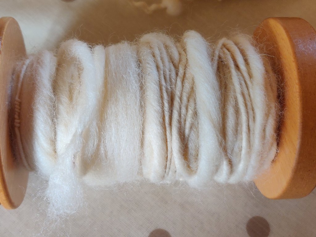 This was spun the 1:8 whorl on my Louet S95 ‘Victoria’, which is the little folding portable wheel I take out to demonstrations. I aim to ply at the same ratio although I know it will probably work out a bit less. I am looking forward to spinning and plying this.