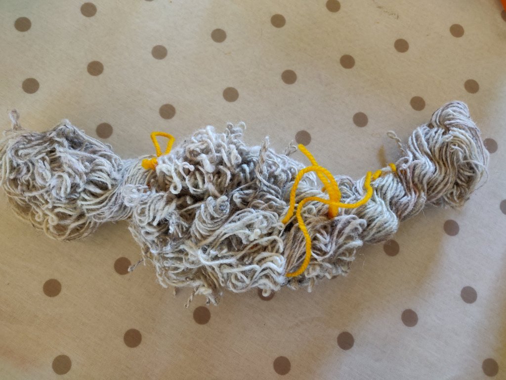 Having read about this spinning technique I though I’d have a go. It doesn’t save much time as you still have to run the yarn back through the wheel, which takes as long as simple plying. It was prompted by my practise at making a ”Z’ twist fat singles’ and so I decided to over-twist this singles yarn as I practised the night before a dyeing session. So I treated it cruelly when washed it, and also in the hot dye bath as well.