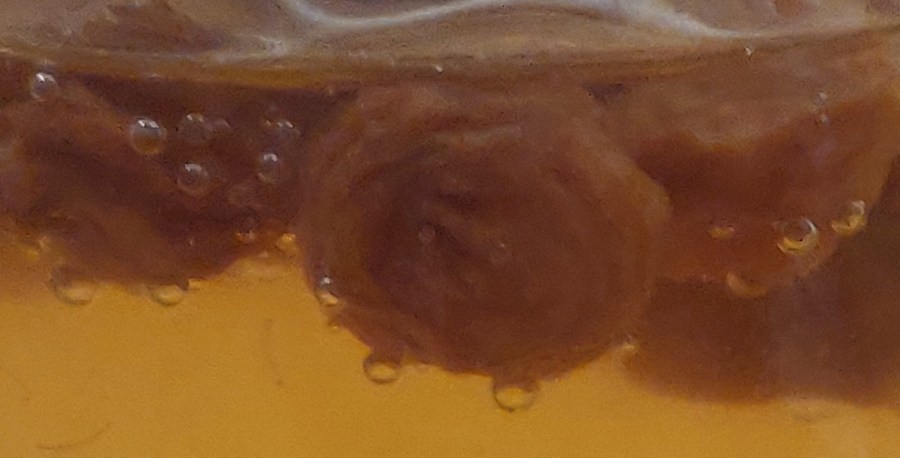 Suint is explained it chemical terms by other people far better than me, but basically it means that the fleece soaks in a liquor composed of the sweat and dirt and developing microbes. The bath is built up from other fleeces. I use the dirtiest fleece first as that made the best base for the suint and have worked through 5 fleeces weighing about 1-2 kg each before going into the bath. I skirt and sort the fleece first because I don’t see the point in washing really dirty stuff that’s never going to come clean, but I equally try to preserve as much of the fleece as possible. I’ve got a bucket of the really unsalvageable stuff soaking so that I can use that liquid as a fertiliser as well.