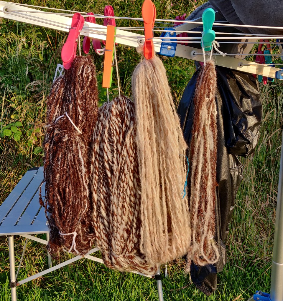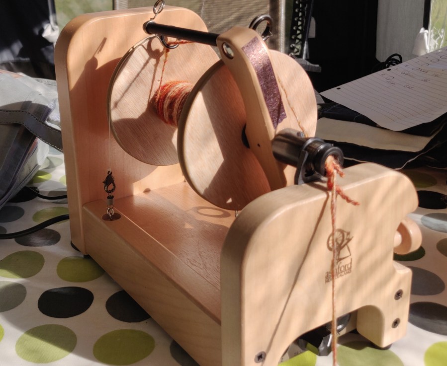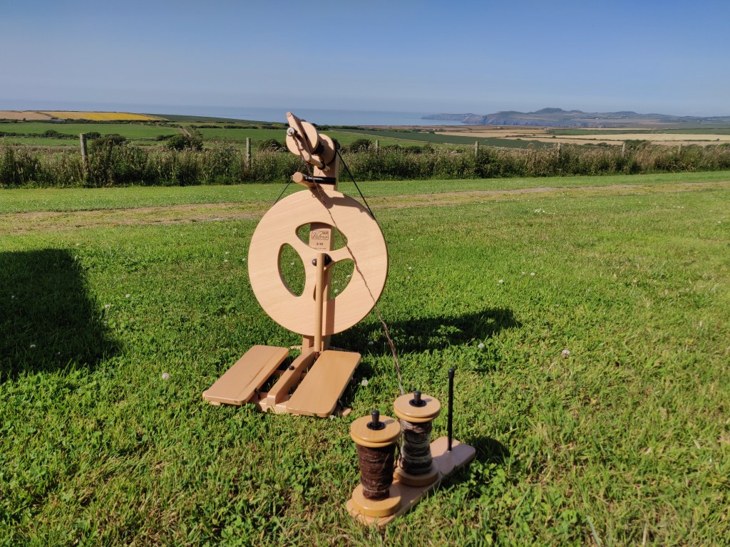 A bit like outdoor anything – providing its not raining or freezing – spinning is enhanced by the open-air. I took my little Louet wheel with me whilst on holiday on the Pembroke coast recently. We were being careful and avoiding towns etc in our caravan sitting on a farm, so there was plenty of opportunity to spin in the lovely sunshine. It seems ages ago now, but was so refreshing.