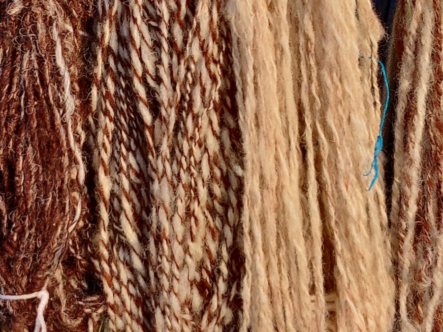 From left: knot or knop marl, slubby marl, onion dyed 2 ply, chain plied random carded colours