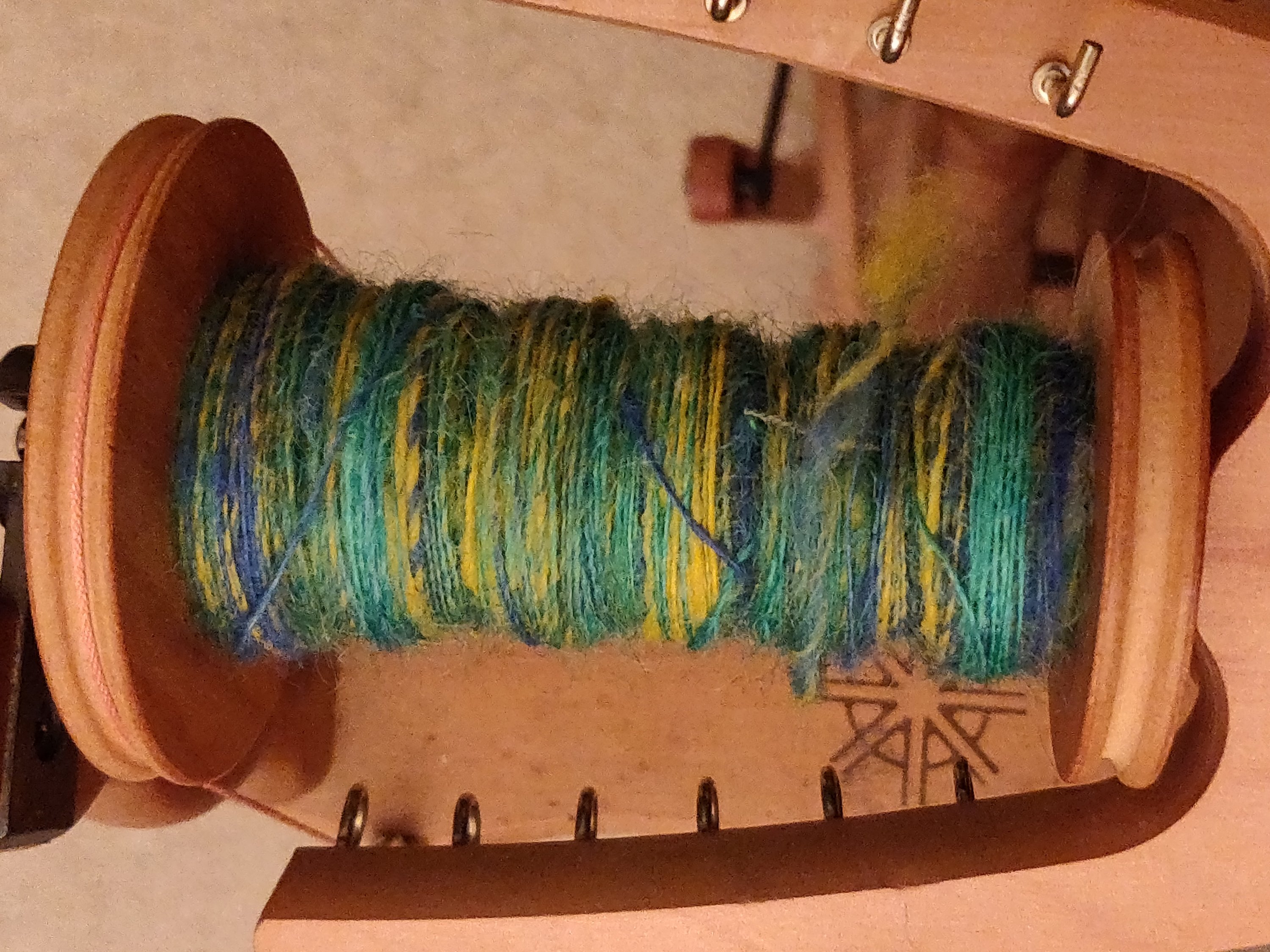 The result felt very similar to the Louet, with the brake band needing hardly any tension, so maybe that is normal after all. I found starting needed care so that the fibre doesn’t pull away too rapidly, but once going it went well. It might be me, but most times after I moved hooks the pull-in became stronger, then settled down again. This must be because the smaller circumference of the bobbin to start with pulls the yarn in faster. Because of this I can see why a Woollee Winder type system might be useful with this tension system, but I am not tempted due to price. The hooks will do me just fine and I really don’t like the sliding hooks on any make so far.