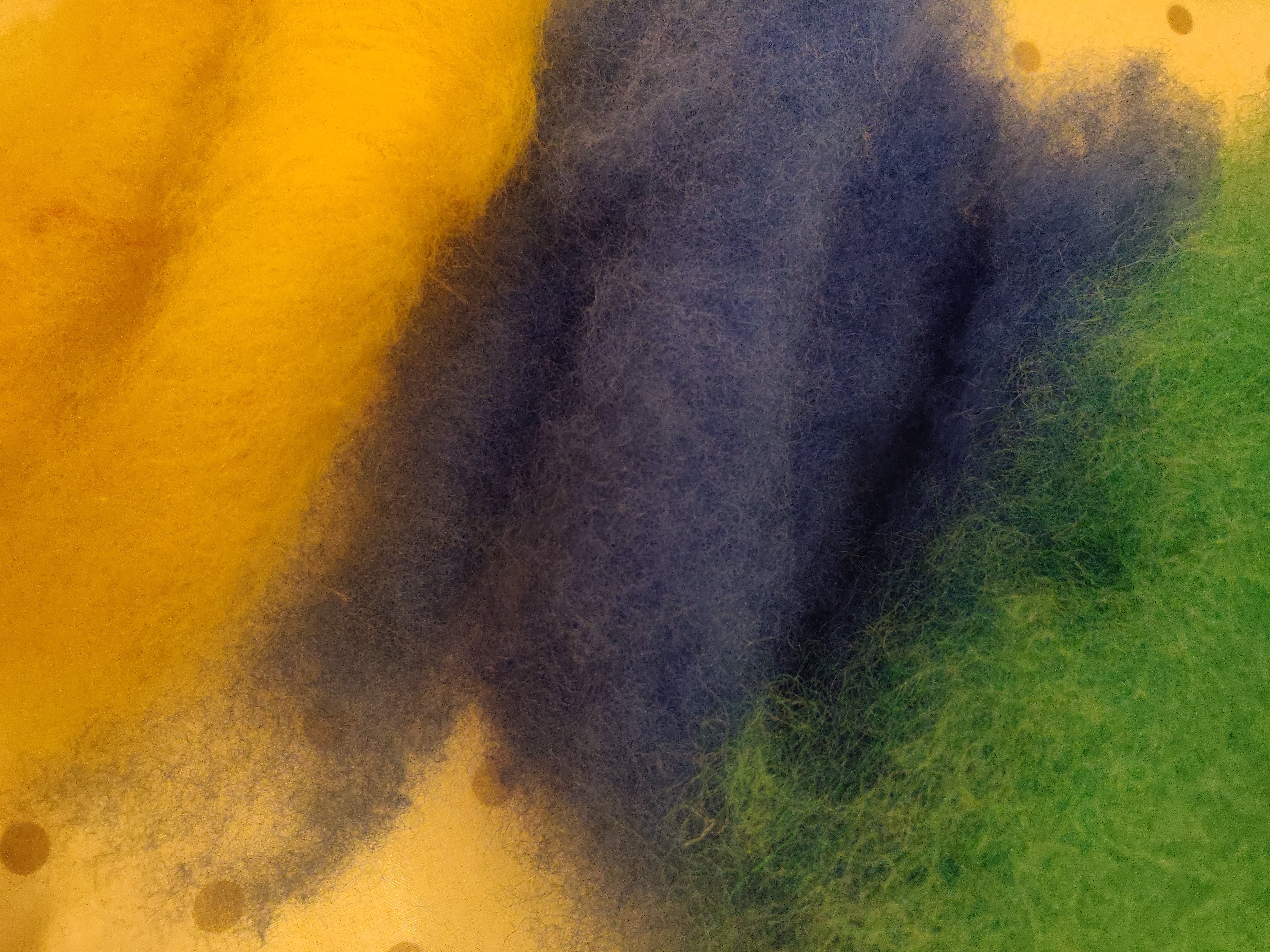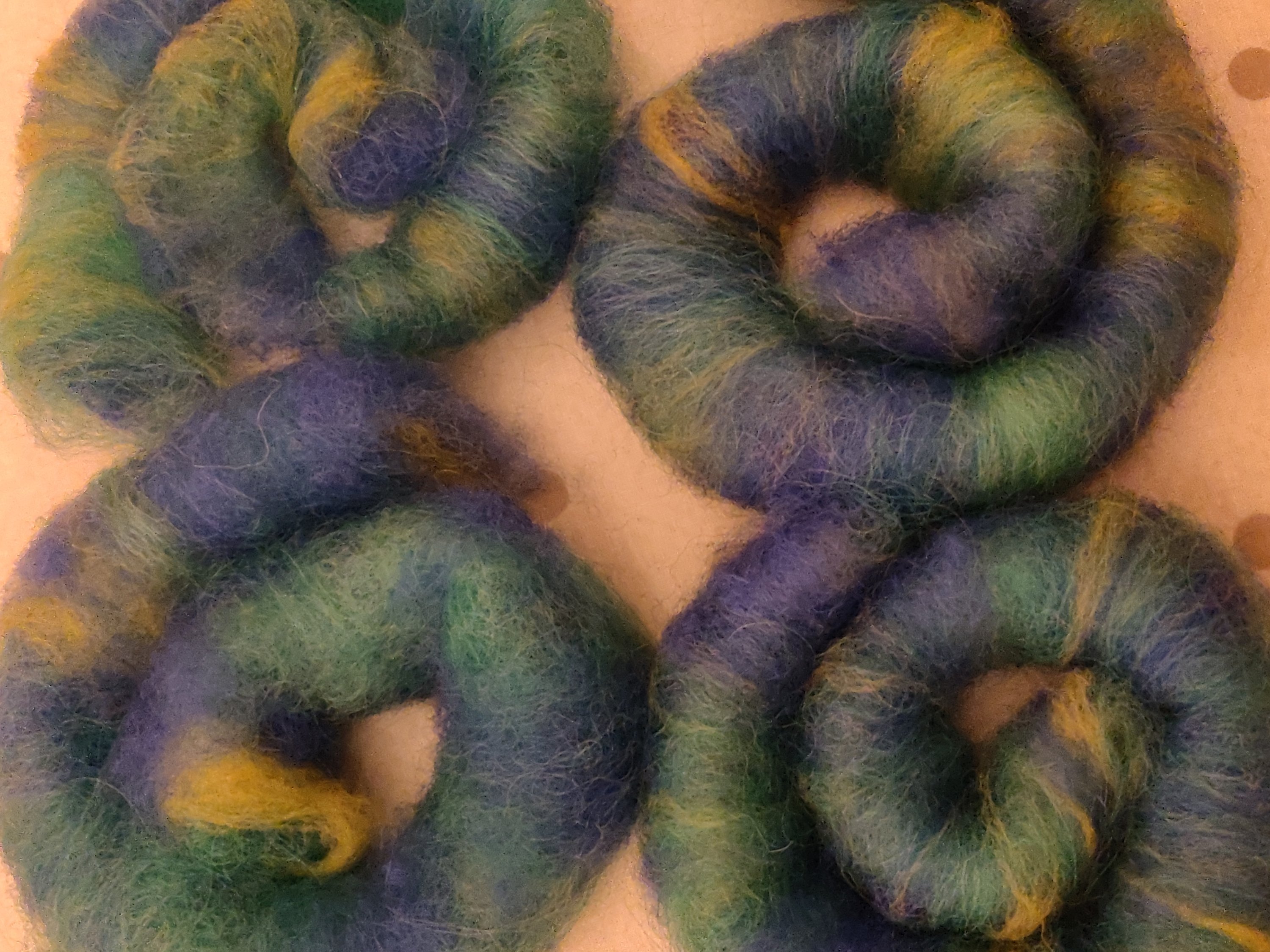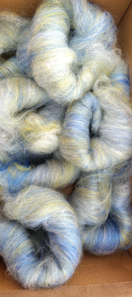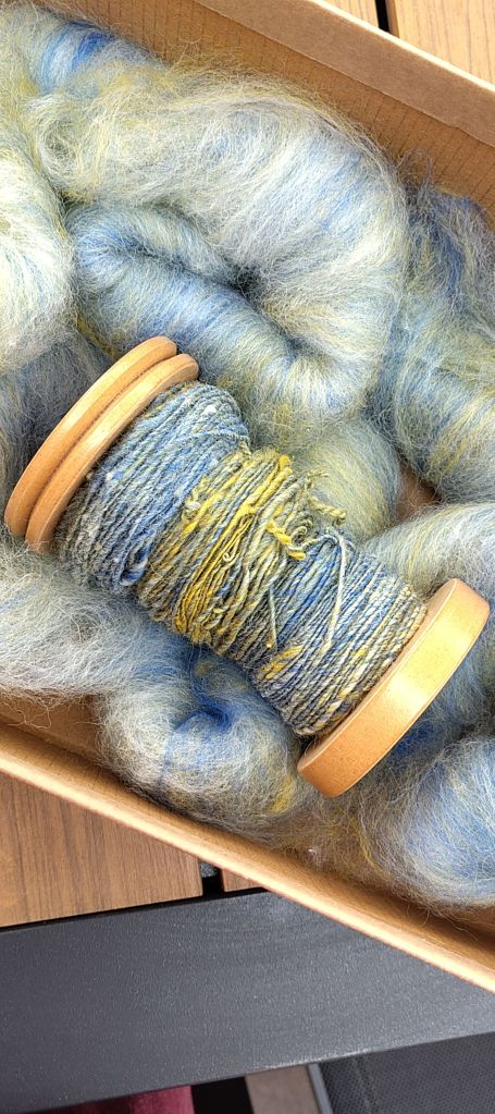 The yellow and natural are broken Merino tops that I picked up at the John arbon Open Day last year. I’ve blended these in equal parts with a very strong ultra marine blue which I won in my local Guild raffle.